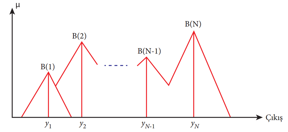 kullanılması için tepeleri olan çıkarım bulanık kümelerine gerek vardır. B(1), B(2)... B(N), 1’den N’e kadar olan kuralların çıkışlarını göstermektedir. Yükseklik metoduna göre durulaştırma işlemi yapıldığında, y0 çıkış değeri,