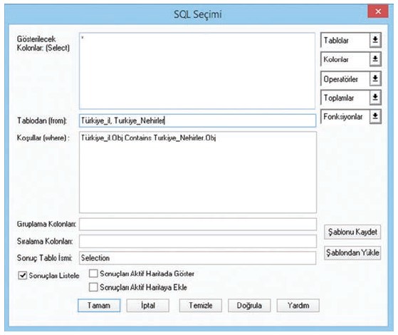 Sorgulama sonucu “Selection” ismiyle yayınlanacaktır, bu bir coğrafi kesişim sorgulamasıdır, sorgulama sonucu çıktı tablosunun bütün veri alanları (kolonları) gösterilecektir.