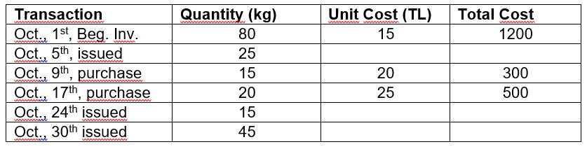 According to FIFO, cost of the material at the warehouse should be calculated as follows: (15 x 20 TL) + (20 x 25 TL) = 800 TL