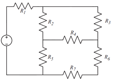 Şekildeki devrede R1=R2=R3=R4=R5=3 Ω , R6=2 Ω , R7=1 Ω ve kaynak gerilimi V=12 Volt olarak verilmektedir. Buna göre devre akımının değeri kaç A’dir?