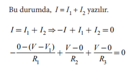 Düğüm denklemleri yazılırken, Kirchhoff’un akım yasasına göre düğüm noktasına gelen akımlar eksi (–), düğüm noktasından giden akımlar artı (+) alınır.
