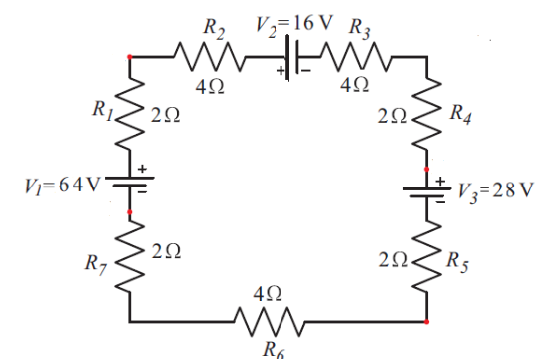 I.R1 + I. R2 + 16 + I. R3 + I. R4 +28 + I. R5 + I. R6 + I. R7 – 64 = 0