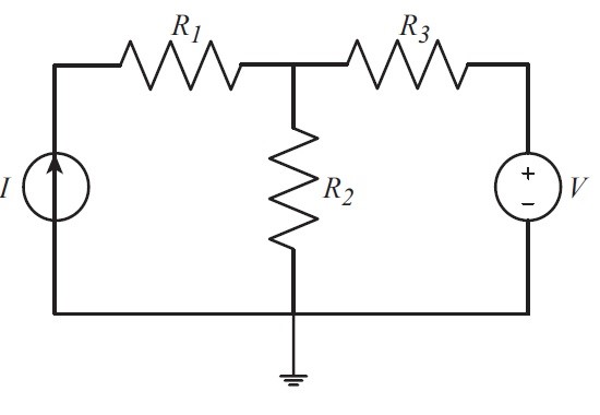 Şekildeki devrede R1 = 1 ?, R2 = 4 ?, R3 = 2 ?, gerilim kaynağı değeri V =10 V ve akım kaynağının değeri I = 4 A olarak verilmiştir. Verilen devrede R3 üzerindeki gerilimin değeri kaçtır?