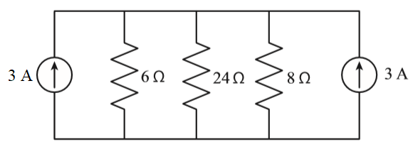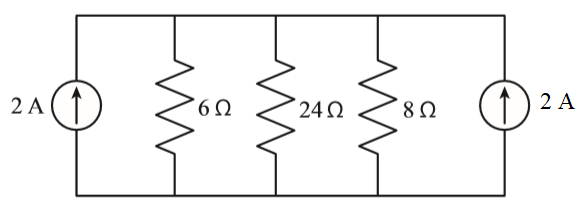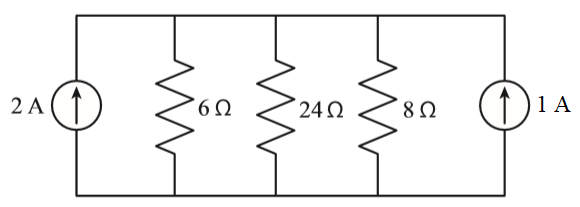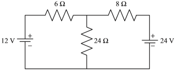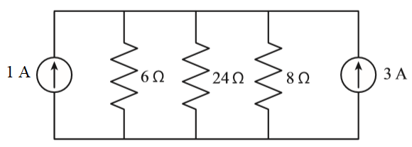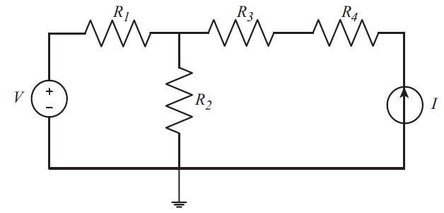 Şekildeki devrede R1 = 3 ?, R2 = 5 ?, R3 = 4 ?, R4 = 2 ?, gerilim kaynağının değeri V = 2 V ve akım kaynağının değeri I=10 A olarak verilmiştir. R1 üzerinden geçen akımın değeri nedir?