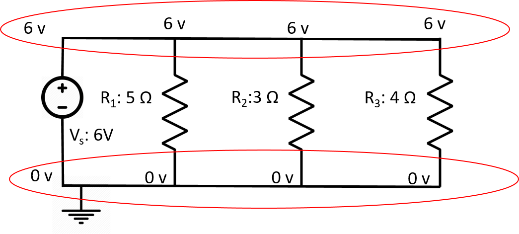 Voltaj kaynağının diğer ucunu da 6 volt olarak yazabiliriz. Budurumda devrenin üst kısmı 6v iken alt kısmı ise 0 volttur.