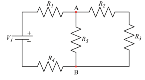Şekildeki devrede R1 =10 ohm , R2 =5 ohm, R3 =5 ohm ve kaynak gerilimi (V) 40 Volt’tur. VAB (A ve B noktaları arasındaki) gerilimi kaçtır?