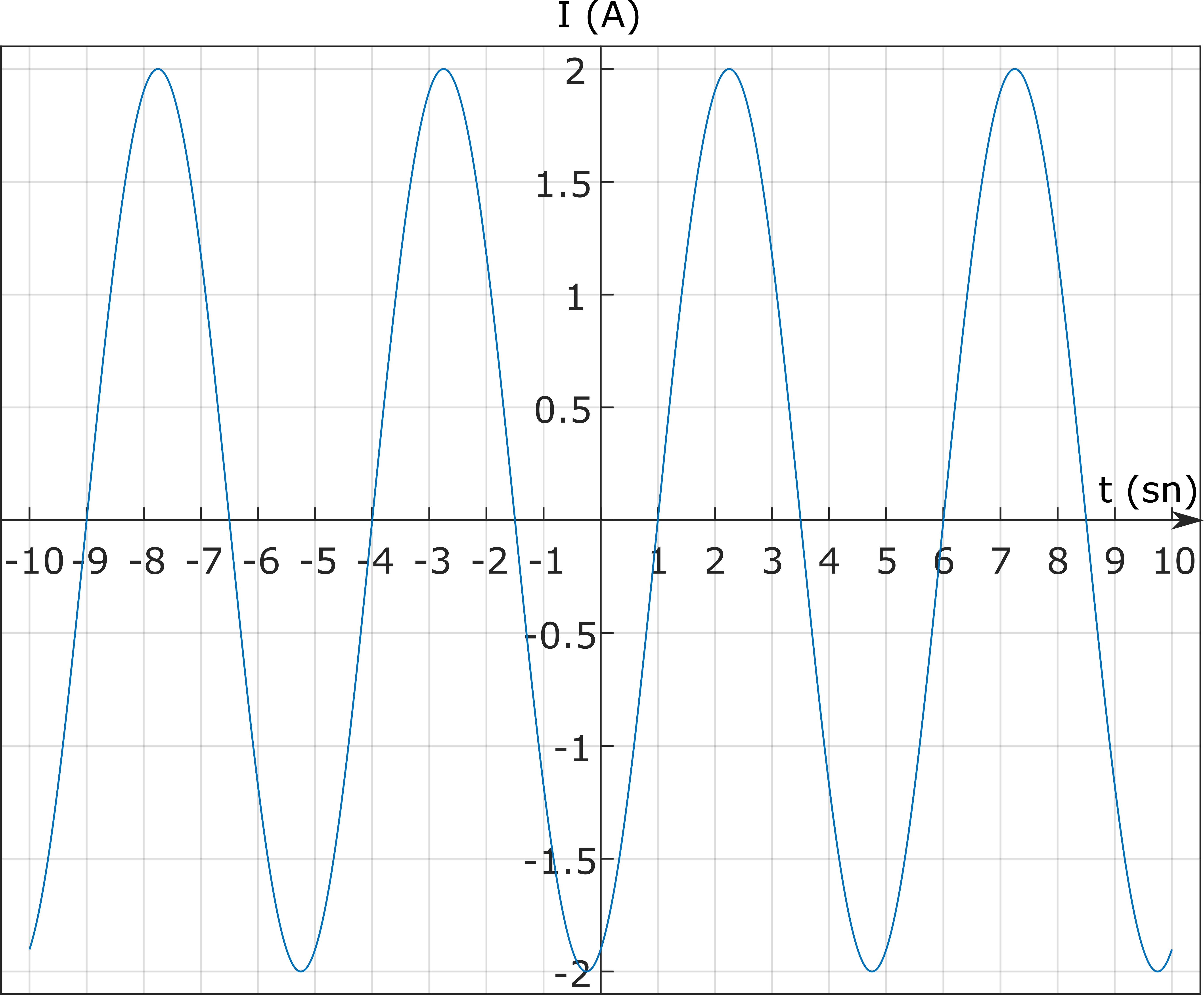Verilen alternatif akımın periyodu T=6-1=5 sn'dir. Bu akımın frekansı ise Hz'dir. Açısal frekans ise
