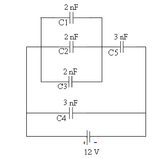 C =3.10-6 F , Q1 = 15.10-6 Coulomb , Q2 =36.10-6 Coulomb |