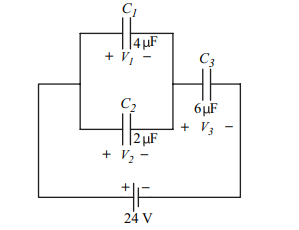 C =6.10-6 F , Q1 = 18.10-6 Coulomb , Q2 =24.10-6 Coulomb |