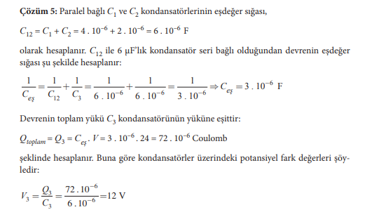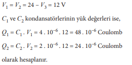 Şekildeki devrede eşdeğer sığa ile C1 ve C2 kondansatörlerinin yük değerleri nedir?