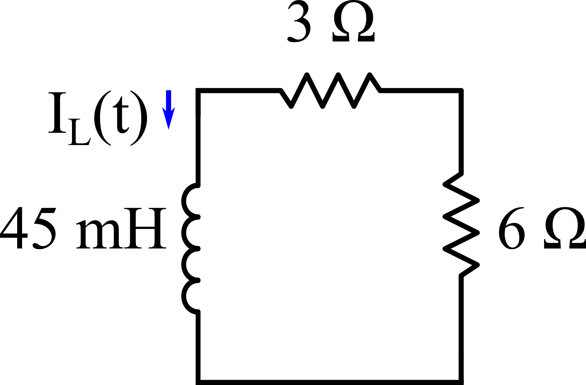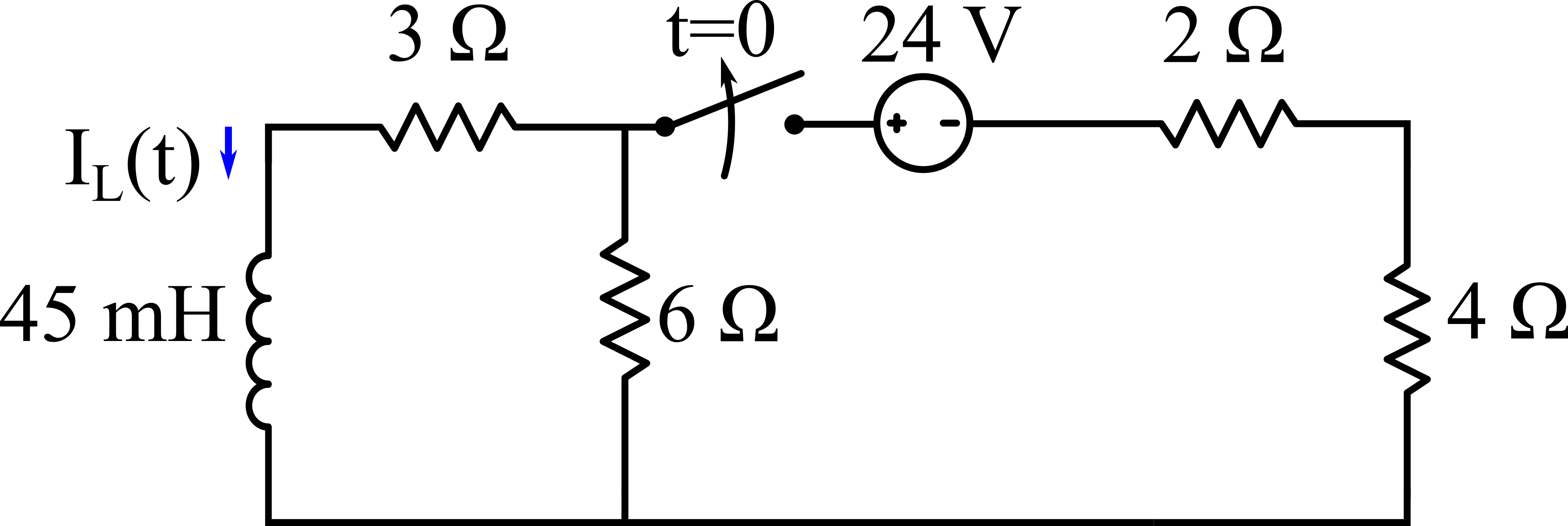 Anahtar t = 0 anında açıldığında devre yukarıdaki gibi olup, seri bağlı 3 ?'luk ve 6 ?'luk dirençler ve L = 45 mH'lik bobinden oluşmaktadır. Bu devrenin zaman sabiti msn olmaktadır. Böylelikle IL(t) akımının zamana göre ifadesi