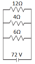 Paralel devrede herbir direnç üzerine düşen gerilim devrenin gerilimine eşit olacağından yani 12 ?'luk direnç üzerine düşen gerilim 72 V olacağından V=IR formülüne göre 72V=I.12 ? olacaktır. Böylece, I=6 A olarak bulunur.