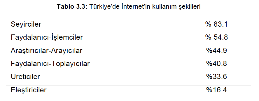 Bu bulgulara bakıldı!ında Türkiye’de İnternet’i kullananlar arasında seyircilerin oranının en fazla olduğu dikkat çekmektedir. İnternet ortamında üretici olarak tanımlayabileceğimiz kullanıcı türünün ise oransal olarak en düşük sayıyı içerdiği görülmektedir. Araştırma raporunda, ‘eleştiriciler’ için, İnternet kullanıcıları arasında küçük bir azınlıktır (% 16,4), eleştiriciler İnternet’teki içeriği izlemekle kalmamakta, yorumlamakta ve tartışmakta, sadece haber almamakta, haber de eklemekte, İnternet’e yüklenmiş içerikleri puanlamakta ve yorumlamakta, saptaması yer almaktadır. Söz konusu araştırma kullanım pratiklerine ilişkin de "öyle bir sonucu ortaya koymaktadır: “ İnternet kullanım sıklığı skalası “ya hep ya hiç” arasında gidip gelmektedir, Yani, internet kullanmaya başlayan kişi her gün internete giren kişiye dönüşmektedir ve interneti “nadiren” kullananlar hiçe yakındır. Bununla birlikte kullanım sıklığına eşlik eden bir derinlikten bahsetmek mümkün değildir. Düzenli internet kullanıcısı, demokratik kamusallığın belkemiğini oluşturan interneti tartışma için kullanma alışkanlığından yoksundur. Düzenli internet kullanıcısı interneti yoğun bir şekilde izler ama içerik üretmekten kaçınır.”