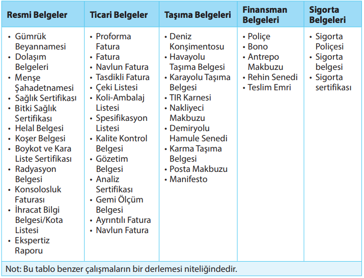 Dış ticaret işleminde kullanılan belgeleri niteliklerine göre, ticari belgeler, resmi belgeler, sigorta belgeleri, finansman belgeleri ve taşıma belgeleri veya belgeyi kullananın tarafına göre, ithalatçı tarafından hazırlanacak/sağlanacak belgeler ve ihracatçı tarafından hazırlanacak/sağlanacak belgeler olarak sınıflandıran çeşitli çalışmalar bulunmaktadır. Aşağıda sunulan tabloda belgelerin niteliklerine göre bir tasnifi yapılmıştır.