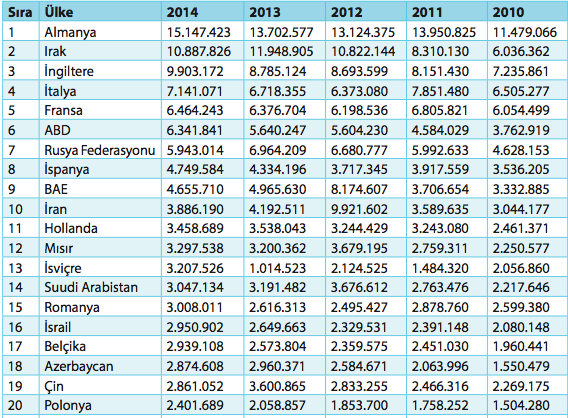 2010-2014 yılları arasında, en çok ihracat yapan 20 ülke arasında Türlkiye kaçıncı sırada yer alır?