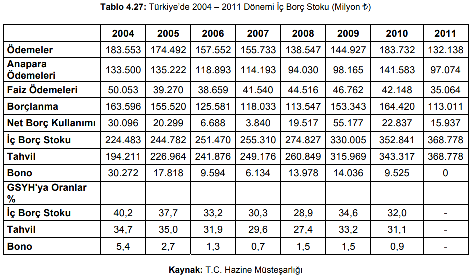Tablo 4.27’de 2004 – 2011 yılları arasında Türkiye’nin iç borçlanma verileri yer almaktadır. 2004 yılında iç borç stoku 224,4 milyar iken dönem içerisinde sürekli artarak 2011’de 368,7 milyara yükselmiştir. Bu durum dönem içerisinde Türkiye’nin iç borç stokunun sürekli arttığın göstermektedir.