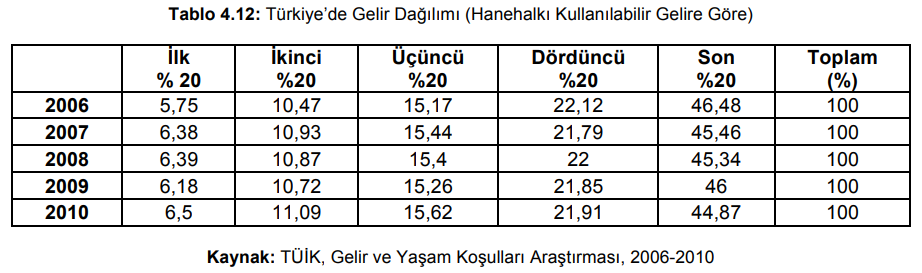 Tablo 4.12’deki istatistikler incelendiğinde Türkiye’de gelir dağılımının oldukça bozuk olduğu görülebilmektedir. İncelenen dönem içinde en bozuk gelir dağılımı 2006 yılında gerçekleşmiştir. Buna göre geliri en düşük olan %20’lik grup 2006 yılında yaratılan gelirden %5,75’lik bir pay alırken, geliri en yüksek olan %20’lik grup ise gelirden %46,48 oranında bir pay almaktadırlar.