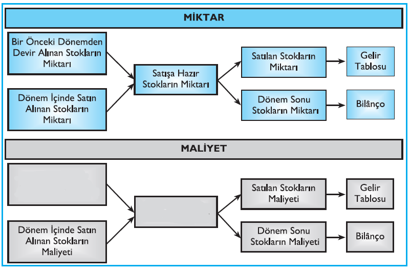 İlgili boşluklara sırasıyla; dönem başı stokların maliyeti ve satılmaya hazır stokların maliyeti kavramları yerleştirilmelidir.