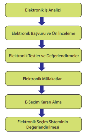 Yukarıdaki şekil incelendiğinde E-İnsan Kaynakları Seçim Sürecinin ilk aşamasının Elektronik İş Analizi, son aşamasının Elektronik Seçim Sisteminin Değerlendirilmesi olduğu görülmektedir. Doğru yanıt B seçeneğidir.