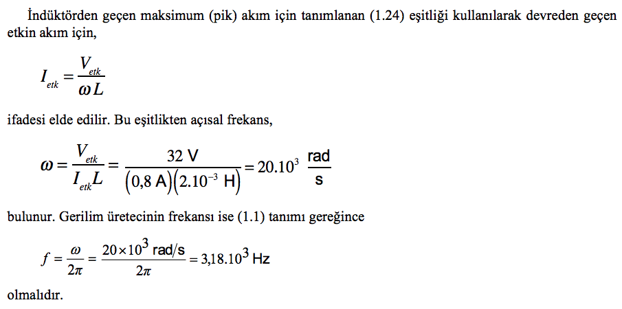 2 mH ’lik bir indüktör, etkin değeri 32 V olan bir ac gerilim üretecine bağlanıyor. Bu devreden geçen akımın etkin değeri 0,8 A ’ dir. Gerilim üretecinin frekansı kaç Hz olmalıdır?