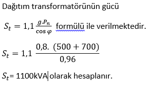 Kurulu gücü 500kW ve 700kW olan iki dağıtım panosunu 0,96 güç faktörü ile besleyecek bir dağıtım transformatörünün gücünü bulunuz.