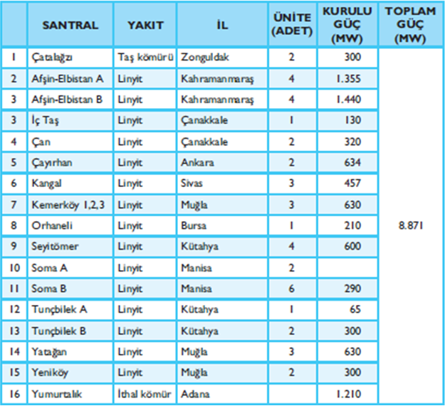 Ülkemizdeki Kömürle Elektrik Üreten Santrallerimiz, Kurulu ve Toplam Güçleri (TEİAŞ, 2007 İstatistikleri)
