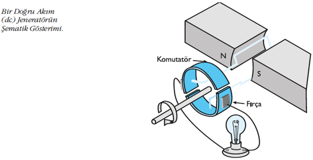 Doğru akım (dc) jeneratörü oluşturan temel elemanlar; komutatör, mıknatıs, tel halka, yüzükler ve fırçalardır.