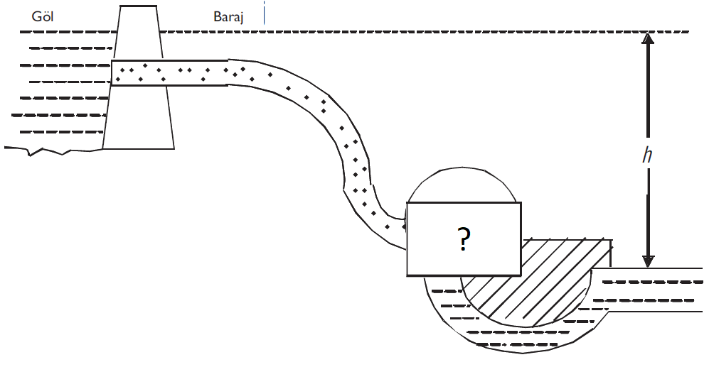 Baraj gölünde biriktirilen su belirli bir yükseklikten düşürülerek santrale ulaştırılır ve burada elektrik enerjisi üretilir. Soru işareti olan bölüm santraldir. Doğru cevap A'dır.
