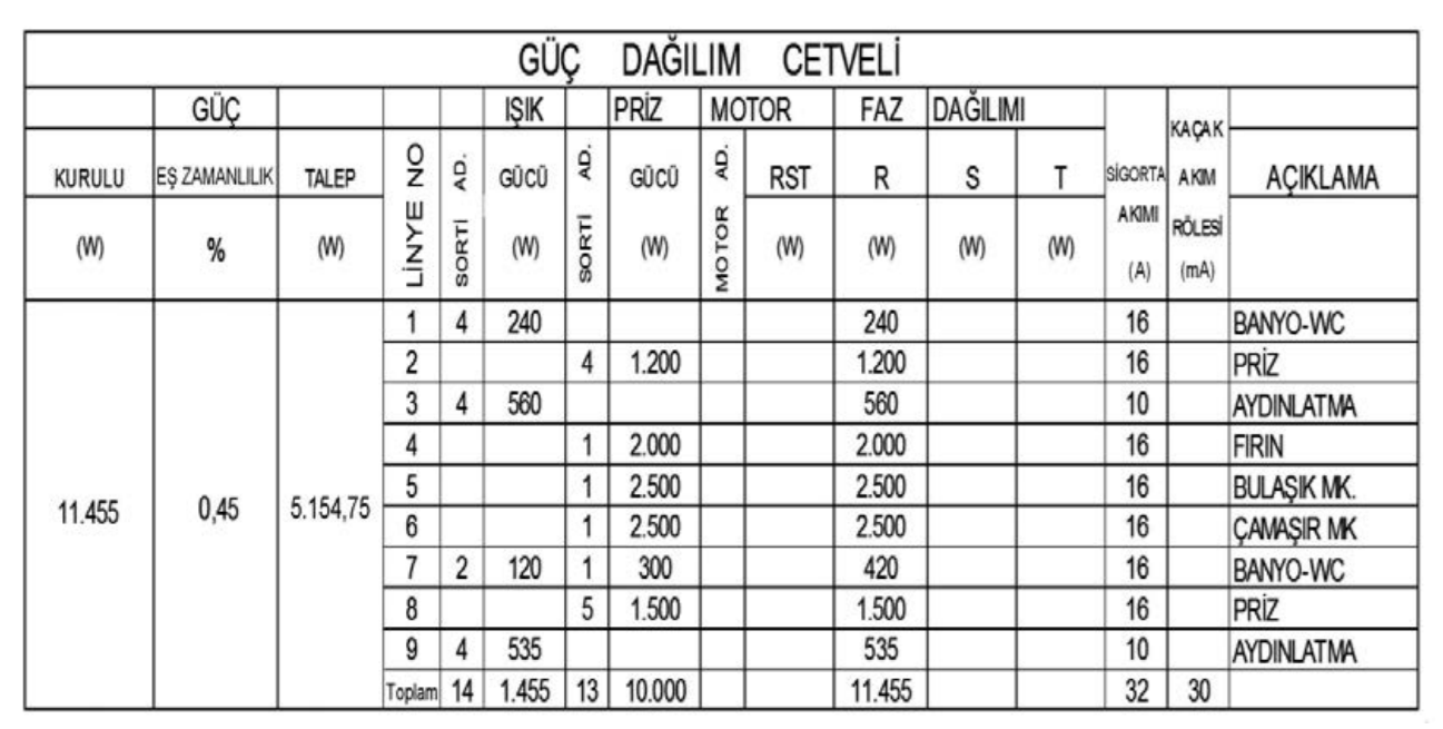 Yukarıda bir elektrik tesisat projesine ait güç dağılım cetveli verilmiştir. Bu cetvele göre aşağıdaki çıkarımlardan hangisi yapılamaz?