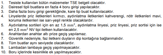 Teknik şartname, Elektrik İç Tesisat Yönetmeliğine uygun olarak, elektrik tesisat projesinin uygulama esaslarını belirler. Tabloda ifade edilen maddeleri içerir.