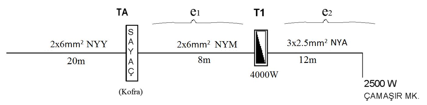 Yukarıdaki şekilde bir yapıdaki en uzun ve yüklü linye için tek hat şeması verilmiştir. Verilen şekle göre, kofra sonrası gerilimin düşümü (%e1+%e2) nedir?