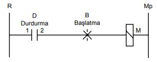 Yukarıdaki devrede, Başlatma butonuna basıldığında M kontaktörü enerjilenir ve paletini çeker. Paletin çekilmesiyle, M kontaktörünün kontakları konum değiştirir. Güç devresindeki normalde açık M kontakları kapanır ve motor çalışmaya başlar. Başlatma butonuna basıldığı sürece motor çalışmaya devam eder. Başlatma butonu üzerindeki etki kalktığında veya Durdurma butonuna basıldığında, M kontaktörü devre dışı kalır ve kontakları normal konumuna döner. Güç devresindeki M kontakları açılır ve motor durur. Doğru cevap C’dir.