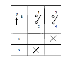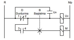 Bu devrede, paket şalter Durdurma (D) konumundayken (1-2) nolu kontak kapalı, (3-4) nolu kontak açıktır. Bu durumda, Uv rölesi (1-2) nolu kontak üzerinden enerjilenir ve kumanda devresindeki Uv kontağı kapanır. M kontaktörü (3-4) nolu kontak açık olduğu için enerjilenemez, kontakları normal konumundadır ve motor çalışmaz. Paket şalterin kolu Başlatma (B) konumuna getirildiğinde, (1-2) nolu kontak açık, (3-4) nolu kontak kapalıdır. Bu durumda, M kontaktörü Uv kontağı ve (3-4) nolu kontak üzerinden enerjilenir, güç devresindeki M kontakları kapanır ve motor çalışmaya başlar. Paket şalter bu konumda kaldığı sürece motor çalışmaya devam eder.Doğru cevap B’dir.