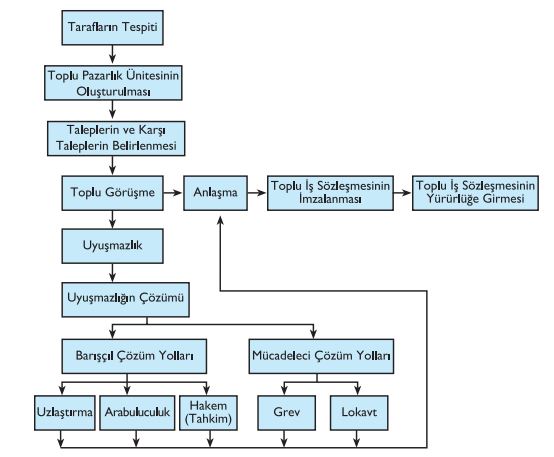 Tarafların tespiti ile başlayıp toplu iş sözleşmesinin imzalanmasıyla sona eren toplu pazarlık süreci, birbirini takip eden çeşitli aşamalardan oluşmaktadır.