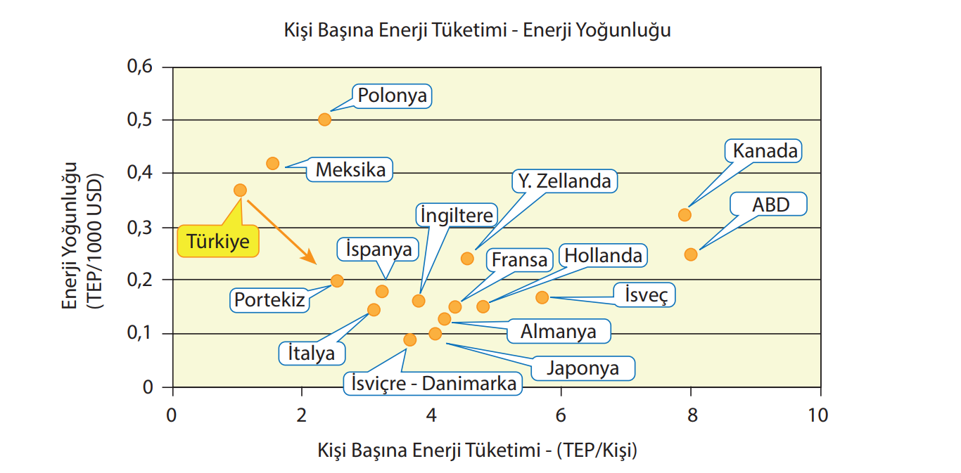 Aşağıdaki grafikte görüldüğü üzere kişi başına enerji tüketiminin en fazla olduğu ülke ABD dir