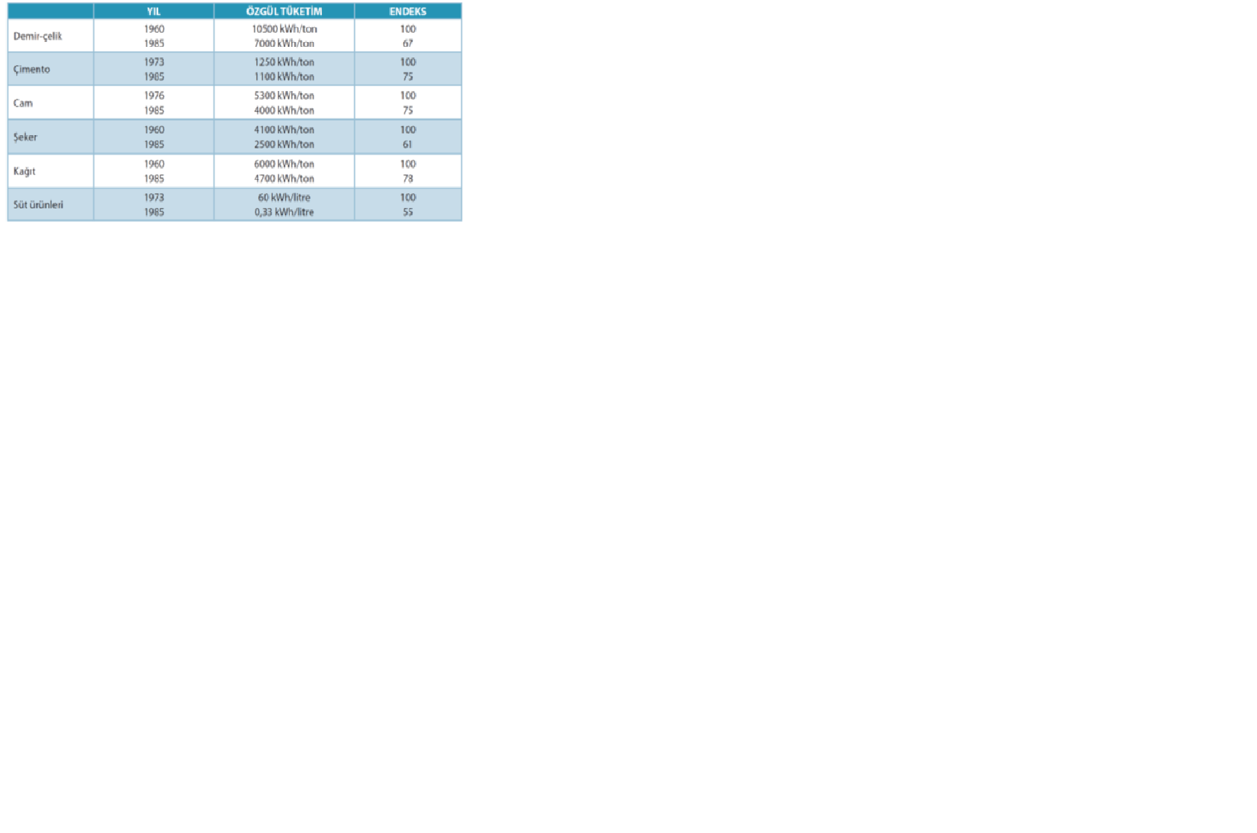 Aşağıdaki tabloya göre özgül enerji tüketimindeki azalma en fazla hangi sektörde meydana gelmiştir?