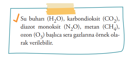 Su buharı, karbondioksit ve metan gibi bazı gazlar atmosferde sera etkisine neden olan gazlardır. Güneş tarafından yeryüzüne düşen ışınlar atmosferin çeşitli bileşenleri tarafından ya yansıtılır ya emilir ya da herhangi bir etkileşim gözlenmez. Etkileşim mekanizmaları çok detaylı olup bu kitabın kapsamı dışındadır. Bununla birlikte yeryüzünden yansıyan belirli başlı bazı ışınlar atmosferdeki sera gazları tarafından tutularak dünyamızın ısınmasına katkıda bulunurlar. Yani sözü edilen bu gazlar ışınları adeta bir sera gibi hapsedip doğrudan uzaya geri dönmelerine engel olurlar. D'dir.