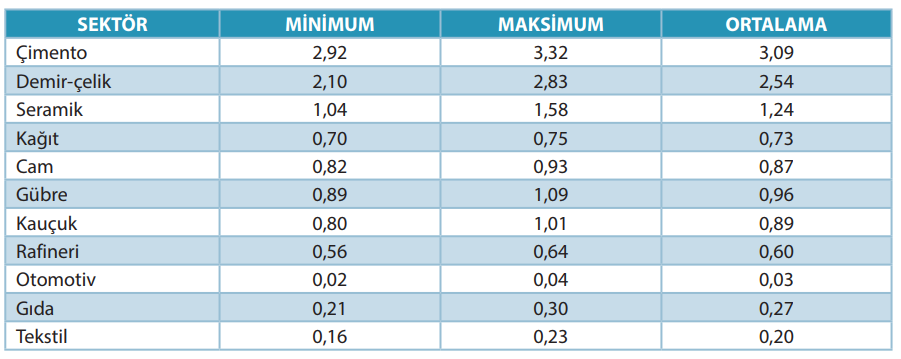 | Tabloda emisyon değerleri (CO2/yıl) olarak verilmiştir. | |||||