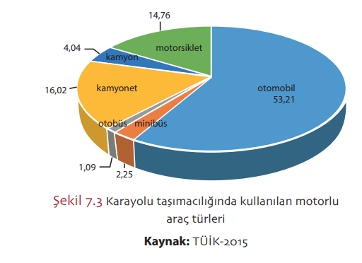 Karayolundaki araçların yarısına yakını dizel motorlu iken benzinli araç oranı ile LPG’li araç oranı birbirlerine çok yakındır ve 20 milyona yakın aracın neredeyse tamamı petrol ürünleri kullanmaktadır. Karayolu ulaşımında motorlu taşıtların büyük çoğunluğu otomobillerden oluşmaktadır. Kullanıcıların ya da tüketicilerin öncelikli tercihi LPG’li motorlar olmakta, onu dizel araçlar takip etmektedir. Demiryolu araçlarında ise durum, gene petrol türevi yakıt kullanan motorlardan yanadır. Dolayısıyla doğru cevap D şıkkıdır.