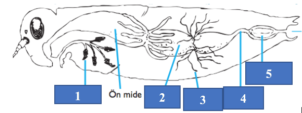 Yukarıda verilen bir sineğin sindirim ve boşaltım sisteminin şematik görünümünde hangi sayı "rectum"u göstermektedir?