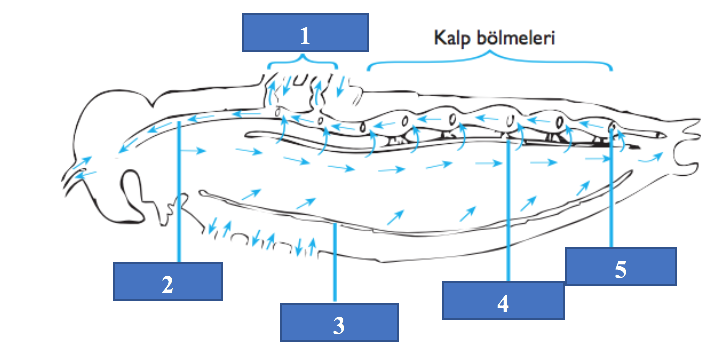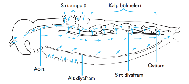Yukarıda verilen bir böceğin dolaşım sisteminin şematik görüntüsünde hangi sayı "aort"u göstermektedir?