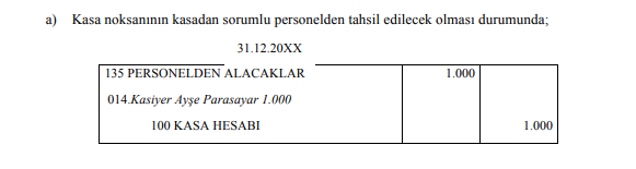 Yapılan kasa sayımı sonucunda kasada 3.000 TL olduğu tespit edilmiştir. Dönem sonu itibariyle kasanın borç tarafı 550.000 TL, alacak tarafı ise 544.000 TL'dir. Kasa noksanından personel sorumludur.