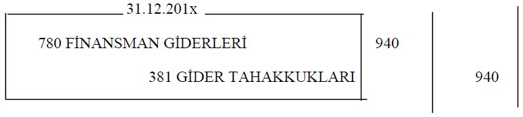 İşletme 1 Kasım 201x tarihinde %30 faizli 20.000 TL’lik banka kredisi almıştır. Kredi faizi ve anapara izleyen yıl Ekim ayında ödenecektir. Döneme isabet eden faiz 940 TL’dir. Ödenecek faizin muhasebe kaydında aşağıdaki hesaplardan hangisine alacak kaydı yapılır?