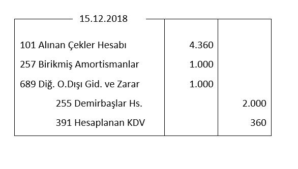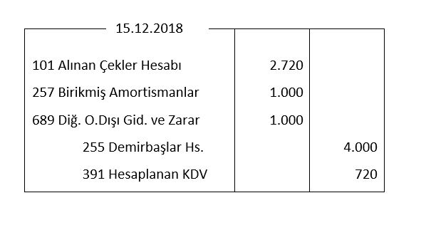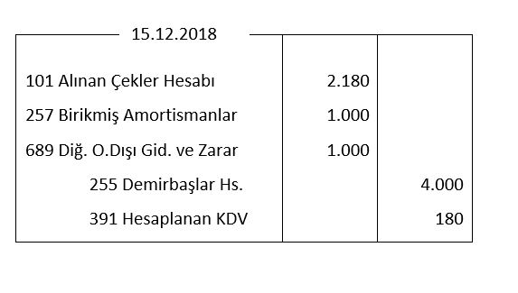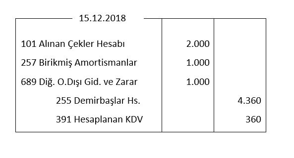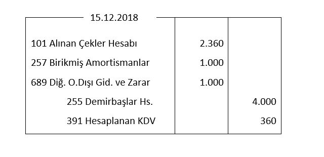 Kayıtlı değeri 4.000 lira ve birikmiş amortismanı 1000 lira olan bir demirbaş, 15.12.2018’de 2.000 +%18 KDV ye çek ile satılmıştır. Aşağıdakilerden hangisi işlemin yevmiye kaydıdır?