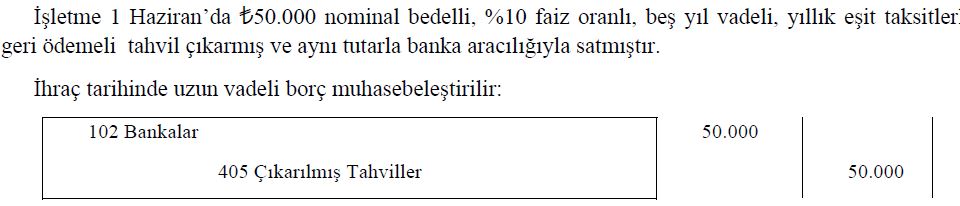 A işletmesi uzun vadeli tahvil ihraç etmiş ve banka aracılığıyla satmıştır. İhraç tarihinde uzun vadeli borç muhasebeleştirilirken aşağıdaki hesaplardan hangisine borç kaydedilir?