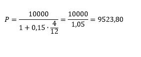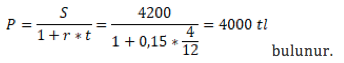 Senet nominal değeri üzerinden iskonto edileceğinden iç iskonto yöntemine göre yapılır. formülüne göre S= 10000 r=0,15 P=10000 t=4/12