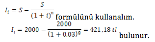 Faiz taşımayan 2.000 tl nominal değerli bir bono, 4 yıl vadeye sahiptir. Bu bono yıllık %6 faizden 6 aylık devreler itibariyle iskonto ettirilirse, iskonto miktarı ne olur?