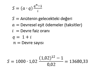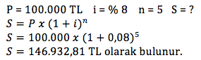 P=150.000 tl i=%2 (aylık olarak yatırıldığı için devre sayısı 12 olarak alınır. Yıllık faiz 12’ye bölünür)