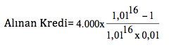 Burada yıllık faiz verildiğinden öncelikle aylık devre faiz oranı hesaplanmalıdır. Aylık devre faiz oranı (%12/12=%1) olarak bulunur. Alınan kredi her ay sonunda, 16 kez yatırılacak 4.000TL’ni,n bugünkü değeri hesaplanarak bulunacaktır.