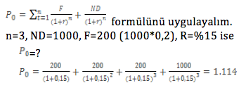 Vadesine 3 yıl kalmış %20 kupon faizli tahvilin nominal değeri 1000 tl'dir. Yılda bir defa kupon faiz ödemesi yapılıyor ve piyasa faiz oranı %15 ise tahvilin değeri ne olur?